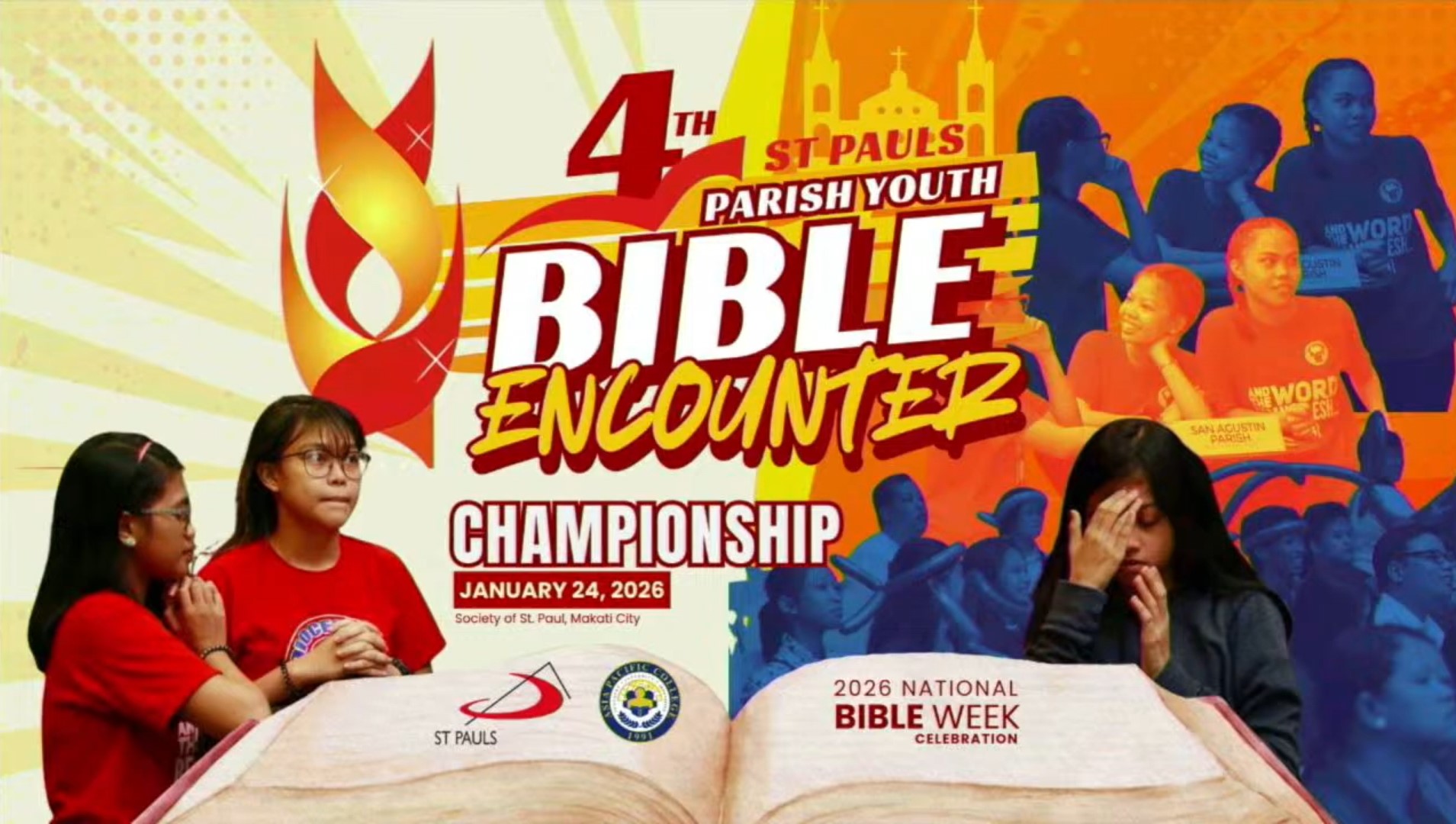 In concomitanza con la celebrazione della Domenica della Parola di Dio (che, nelle Filippine, coincide con la giornata nazionale dedicata alla Bibbia), i Paolini hanno coordinato il gran finale della 4a Parish Youth Bible Encounter (PYBE), presso la Sala Alberione, nella città di Makati. L’evento ha visto la partecipazione di dieci squadre appartenenti ad altrettanti parrocchie dell’arcidiocesi di Manila. Le dieci squadre erano state selezionate per eliminazione in occasione del Bible Quiz del dicembre scorso. Per saperne di più sull’evento e sul suo svolgimento, clicca qui.